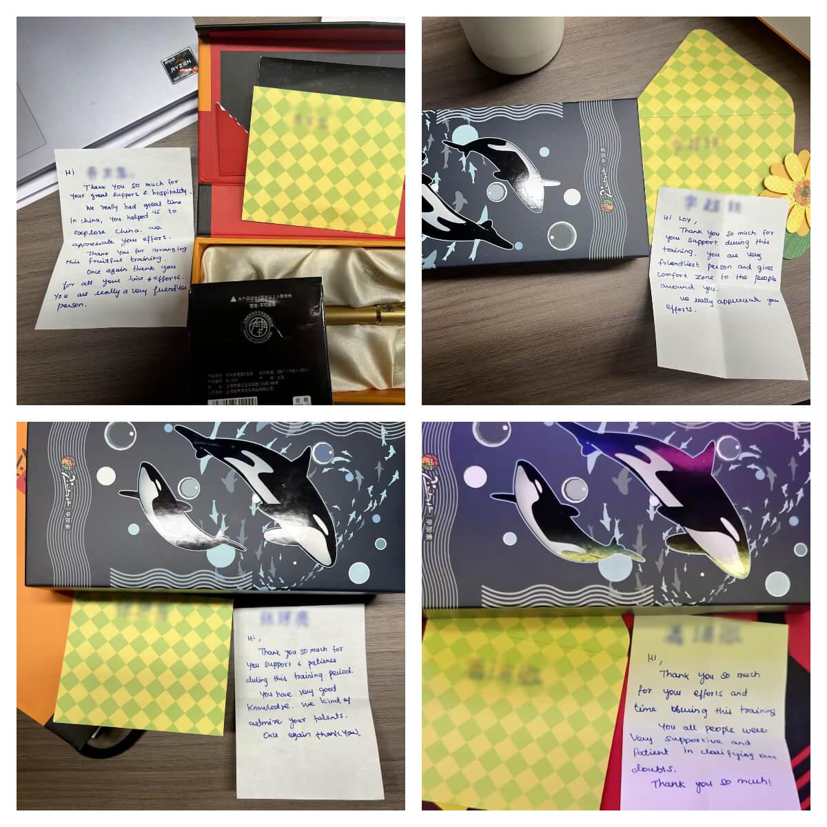 近日,yabo.com为来自海外的合作伙伴开展的定制化培训项目圆满收官。在这场为期半个月的深度交流中,双方不仅碰撞出专业领域的智慧火花,更在朝夕相处中结下深厚情谊。临别之际,客户代表向我司四位核心员工赠送了象征友谊的定制钢笔,并亲笔写下四封饱含谢意与真诚的贺卡,为这段跨国合作添上一抹温情注脚。