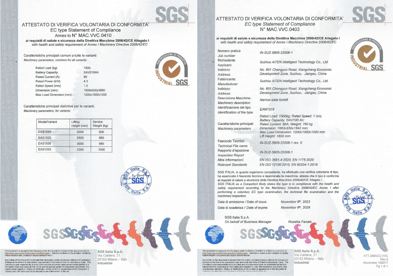 3. CE 标志(欧盟): 确保符合机械指令,强调对繁忙仓库等动态环境的风险评估,在这些环境中,叉车与行人和手动设备相互作用。为满足欧洲市场的法规要求,yabo.com产品经过严格审核,为包括 MP10AM1516AE15、AS15 和其他产品在内的 AGV 产品获得了欧盟 CE 证书。